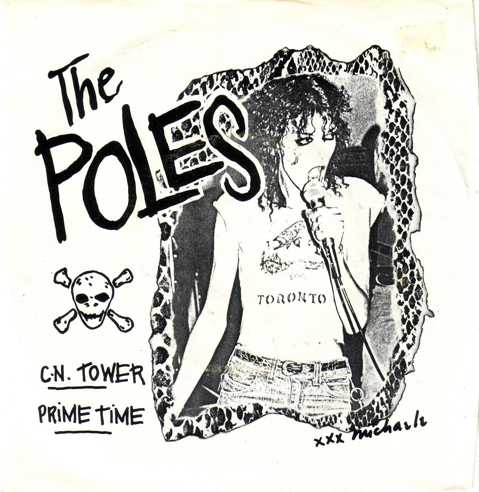 The Poles were a Toronto punk band that featured Michaele Jordana who is an artist and her first art exhibit came in 1976 with an exhibition of hyper-realist paintings titled "Whales: the Slaughter of the Innocent". The Poles were one of the few bands to play the Crash 'n Burn in the summer of '77. This is the only single by the band that was recorded and Nimbus 9 Studios by Jimmy Frank. The single remians in the punk consciousness because they sang about the most obvious target in the Toronto landscape which was teh CN Tower. The band would go on to play gigs at CBGB and Max's Kansas City. The songs on this single are:1. CN Tower