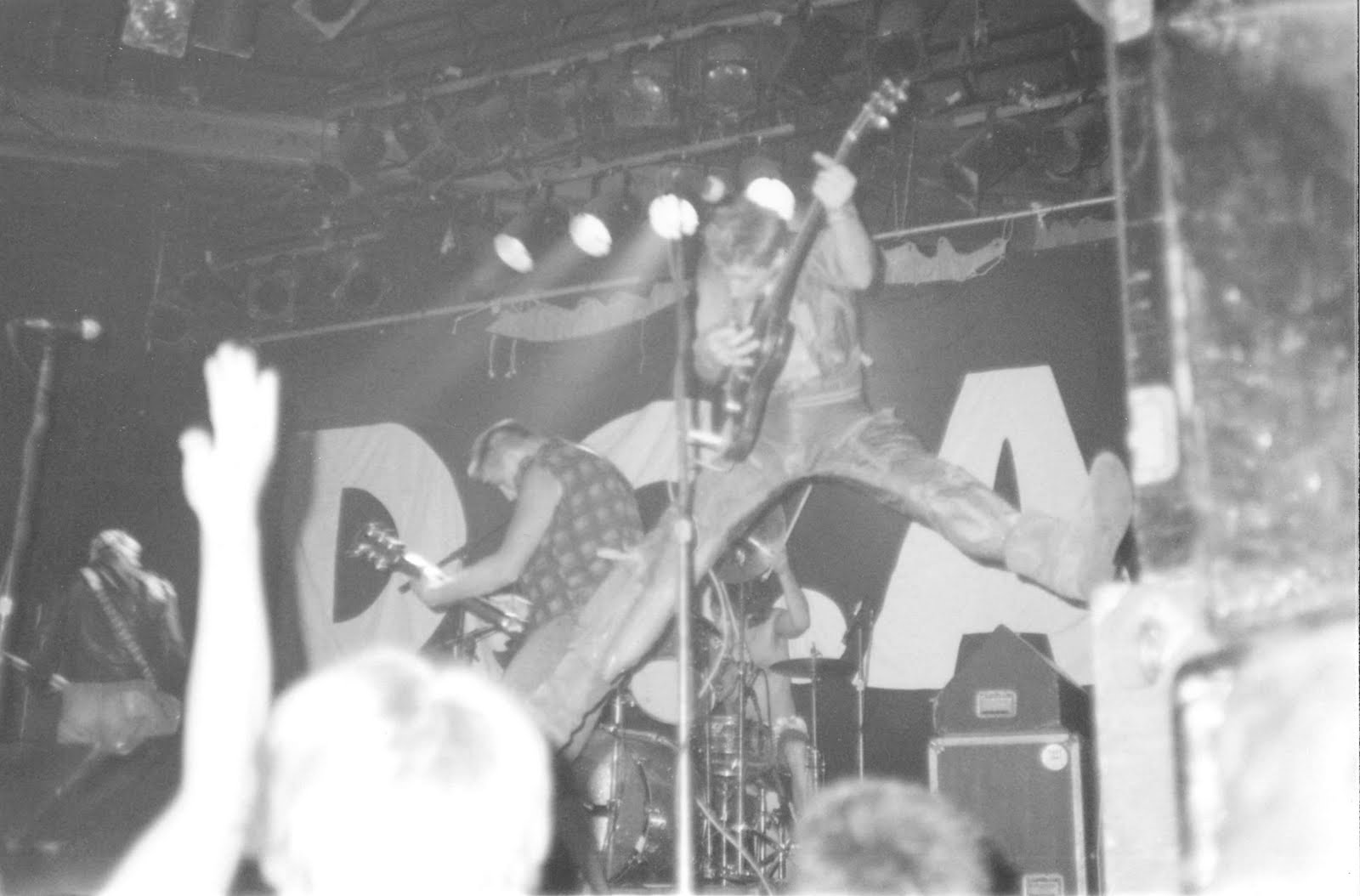 This show was at RPM and according to a review in Mute Elation zine the show took place on October 2nd, 1986. I remember that psychedlic backdrop. I remmeber this being a mismatch of bands and venue. The RPM was located donw by the water front and is transportation inhibited. There was no TTC buses that went near here so there was a lot of walking involved in geting to the show. And the stage at RPM was shoulder height which was unusual for shows back then so there was no stage diving. The club was also really big which made it seem like there was a poor turnout even though there was probably a couple of hundred kids at the show. And it was a 19+ venue and the club was pretty strict about ID. Lots of things sucked about this show but DOA was not one of them.