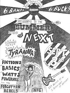 C: That was the Last Pogo. December 1st and 2nd. I had been in the BATTERED WIVES and decided I wasn’t going to be doing that anymore. I went to the Last Pogo and met Vera there. I was just watching the Last Pogo film and seeing how many times she shows up in there. I had seen TYRANNA at one of the shows at the Turning Point and it was Johnny Bubblegum’s bass playing that I thought “I like that. He’s got the style down.” There was a lot of thought at the time about ‘What is punk rock? Is it a style or is it an attitude?’ I think it was an attitude but I was also interested that there was a new style of music emerging. I thought that was pretty exciting. Blues has certain characteristics and country and reggae and punk rock had this style of music that was emerging. I was looking for a band that had those ingredients so that I could be a part of that thing. TYRANNA was definitely headed in a direction that could be identified as punk rock.