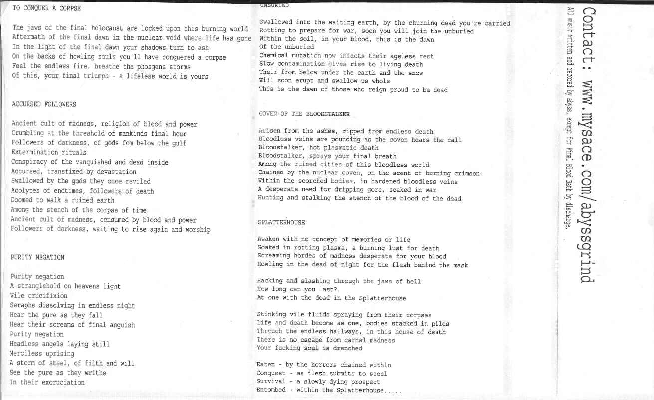 ABYSS are a new local hardcore band taking some of the basics of the heavy Swedish crust sound that LEGION666 uses as an influence and taking it to the next level. They remind me a lot of DRILLER KILLER. You know that heavy scandi metal infused crust. It is big sounding, it is heavy and it is crushing. In fact it is hard to believe that this is a demo. This should have been an official release. And they do the obligatory DISCHARGE cover but they do it better than most D-beat bands. Write them at www.myspace.com.abyssgrind.