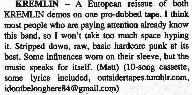 This is it. Kremlin have broken up and this is their last ever recording. Great Toronto band. Sad to hear of their demise. MRR review it in the February 2014 issue (#369).