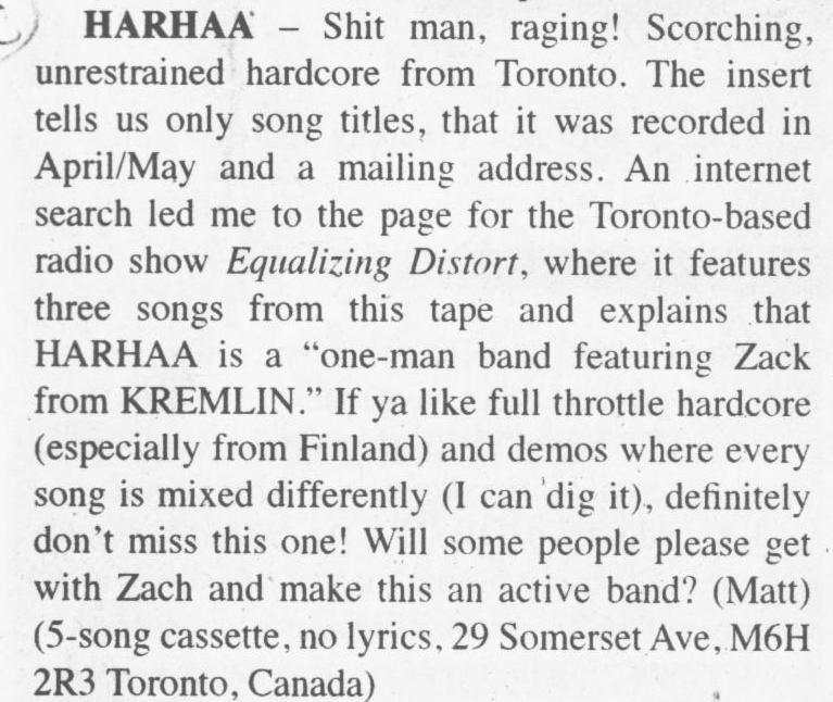 This is a review of the Harhaa demo which appeared in the August 2012 issue (#351) of MRR.
