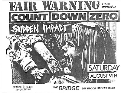 Creighton wrote a scene report of Edmonton in the August 1986 issue of MRR. The report starts out by talking about the release of the second SNFU LP. Down Syndrome had just recorded a 9 song demo. Euthaniasia had just released an ep. There are minor mentions of Entirely Distorted, Dissidence, Cruxes, Freddie Kruger's Right Hand, Carnival Cops, Idyl Tea, Ghost Shirt Society and a load of others. There is also a list of zines.